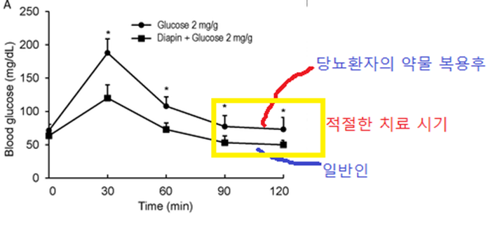 당뇨의 경우 혈액속 당성분이 높아서 혈액의 흐름이 원활하지 않으므로, 약물이 체내에서 배설되는 시간이 오래 걸립니다.